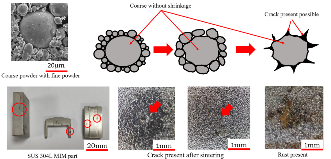 許多研究強(qiáng)調(diào)觀察D10、D50和D90的值。我相信,只要控制好這個(gè)值,高斯分布曲線就會(huì)很漂亮。這可以使粉末模塑產(chǎn)品非常好。然而,很少有人關(guān)注D1~D9和D91-D100,盡管學(xué)校研究機(jī)構(gòu)提醒D97也要注意。在工廠繁忙的生產(chǎn)過(guò)程中,除了D10、D50和D90之外,人們并不關(guān)注粉末的數(shù)值性能。但最終,在制造過(guò)程中,不銹鋼304L或316L上總是會(huì)發(fā)現(xiàn)銹斑。不銹鋼304L/316L零件無(wú)法通過(guò)嚴(yán)格的鹽霧測(cè)試,甚至在不到24小時(shí)內(nèi)嚴(yán)重生銹。如圖1[4]所示。