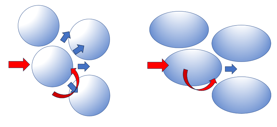 圖4. 左的球狀粉末無(wú)法預(yù)測(cè)并控制其前進(jìn)的方向;右的大米狀粉末被限制要朝著同一行進(jìn)方向